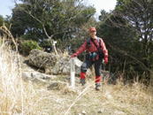 雲取山を下山 12時17分 山頂で昼食タイム。 日陰でゆっくり疲れを癒した後下山した。 ロープを手に |