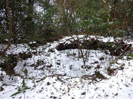 7、たぬき水 11時20分 ここも辺り一面真っ白。チョロチョロと水が流れ出る。飲まずに先へと進む。 寒々しい |