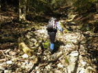 広い河原に行き着いた 9時15分 次はこの川を渡ることになる。 水量が多いのでルートを慎重に選んで岩を渡って行く。 バランス良く |