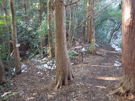 3、山瀬越 9時54分 頓野林道から3分位林の中を歩くと九州自然歩道の尾根道に出た。雪の影響か、無雪期に歩いた時と比べて30分程度遅れていた。 福智山は右へ |