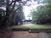 鳥居を潜り石段を上って行くと、夏草が綺麗に刈り取られたグリーンの世界。その中で中宮神社の拝殿が一際明るく光っていた。ここで下宮神社に引き続き2度目の参拝をした。 |