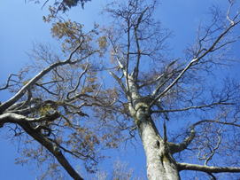 シークレットビューポイント 8時11分 黒岩山への分岐表示を背に小高い丘がある。そこはH師匠お勧めのシークレットビューポイントだ。「行ってみよう!」とそこに寄り道をした。渓谷を挟んで障子ヶ岳方面を見ると、迫力あるバッドレス(垂直に近い岩壁)が目に飛び込んでくる。以前はよく見えていたそうだが、現在は木々が茂り視界不良だ! |