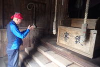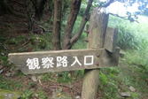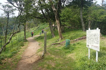 道路に出る 13時04分 飛び出したのは豊前坊手前の道路だった。道路の手前に大きな説明看板があったので読んでみると、我々が歩いていた道はかつて山伏が歩いていた峯入り道だった。 この道は道路を横切り、更に細い道となって続いている。 |