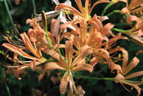 | 夏真っ盛りの日曜日、脊振山系の井原山にオオキツネノカミソリ鑑賞を目当てに出かけた。 群生地に着くと、辺り一面がオレンジ色の花で埋め尽くされていた。 「10年に一度の開花」だと常連の方が言っていたそうで、これほど見事だとは思わなかった。 歩くのがとても楽しい一日だった。 |