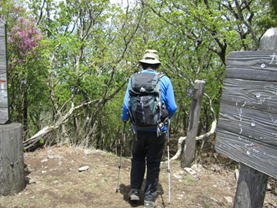 | この笈吊岩(おいつりいわ)の由来は、その昔、修験者たちがあまりの険しさに背負っている「笈」(四角い箱のようなもの)を背から下し、ひもで吊るして引き上げたと言われているところから、その名前が付いたと言われている。 今回実際に上って見たが、鎖があるとはいえ決して油断は許されない。上り終えるまで緊張の連続だった。上り終えて、「滑落事故多発」の看板を見た時、本当に「ゾッ」とした。(実は上る前にもこの看板があったのだが、見落としていた) ※この岩登りは挑戦しないことをお勧めします。 ちゃんと「う回路」があるのでそちらを利用する方が間違いなく賢明です。 という訳で、少々安堵し尾根歩きに入った。そこにはシャクナゲの花々が待っていた。 9時37分 シャクナゲを観賞し、写真を撮りながらゆっくり尾根を歩くことができ、とても気分がよかった。 |