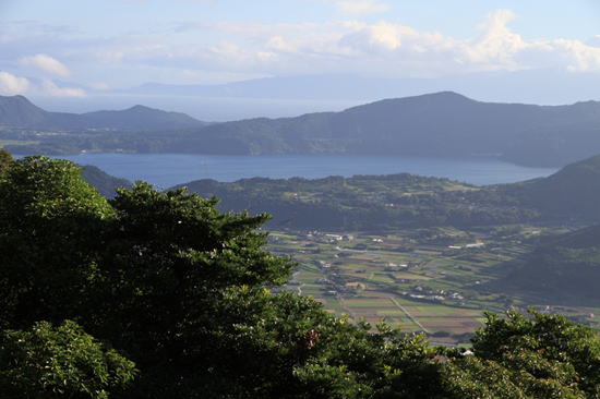 5合目より池田湖を望む 7時39分 朝日が眩しい