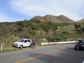 正面に硫黄山を見て進む。噴煙が上がり、鉛色の山肌が硫黄で部分的に黄色くなっている。