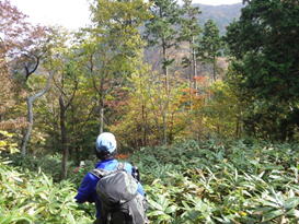紅葉する高岳山の稜線歩き 背丈近くまで伸びたクマザサが茂る登山道